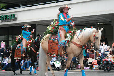 This year's parade highlights include 14 colorful, floral-covered floats, including a self-built entry from Reed College. Reed is marking its own milestone, celebrating 100 years of excellence in education. To reflect this year's rousing Rose Festival theme, Rock 'n' Roses, the parade featured more music than ever. 18 traditional marching bands joined in the lineup by several dancing groups and three live acapella singing groups-the latter representing the best of a new Rose Festival event, the Rose City Sing-Off. 21 equestrian groups, plus marchers, dancers and special guests in vintage automobiles fill out the 90+ entries.